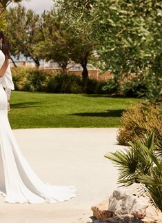 A romantic boho dream can be found in this elegant crepe and chiffon wedding dress. With exquisite, sheer vintage lace detailing the waist and cuff of the dress, this design also features a beautiful keyhole back perfect for a modern boho bride with a dramatic flair.