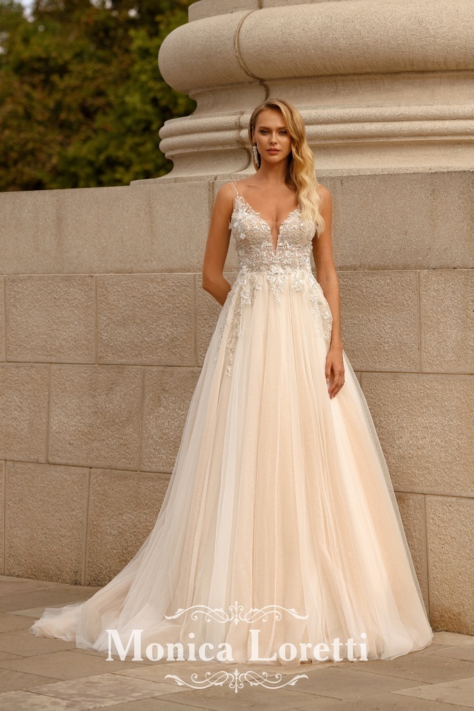 A mesmerizing wedding dress with a glittering tulle skirt, 3D floral embellishments, and delicate lace details. Pure enchantment in one gown