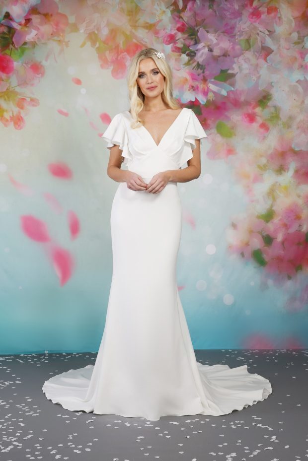 Wondrous frill sleeve stretch jersey dress which is simple yet modern. For the bride that doesn’t want too much, this dress is a perfect choice. The bodice features a low V-neck and the frill sleeves add a delicate touch to the dress. The back features a charming finish of buttons trailing from the bodice to the end of the train. After every three jersey covered buttons, there is a sparkling crystal button.