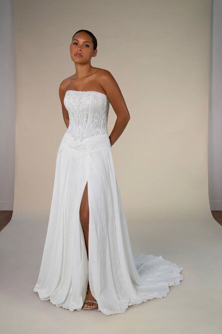 All who wander is a collection of boho wedding dresses that embrace the unexpected and reveal a part of you that, while always wandering, is never lost. From whimsical laces and dreamy patterns to daring designs and bold embellishments, each dress embraces your authentic beauty. Whether your style is more modern minimalist or romantic goddess, there’s a breathtaking gown fit for your bridal journey, wherever it may lead.