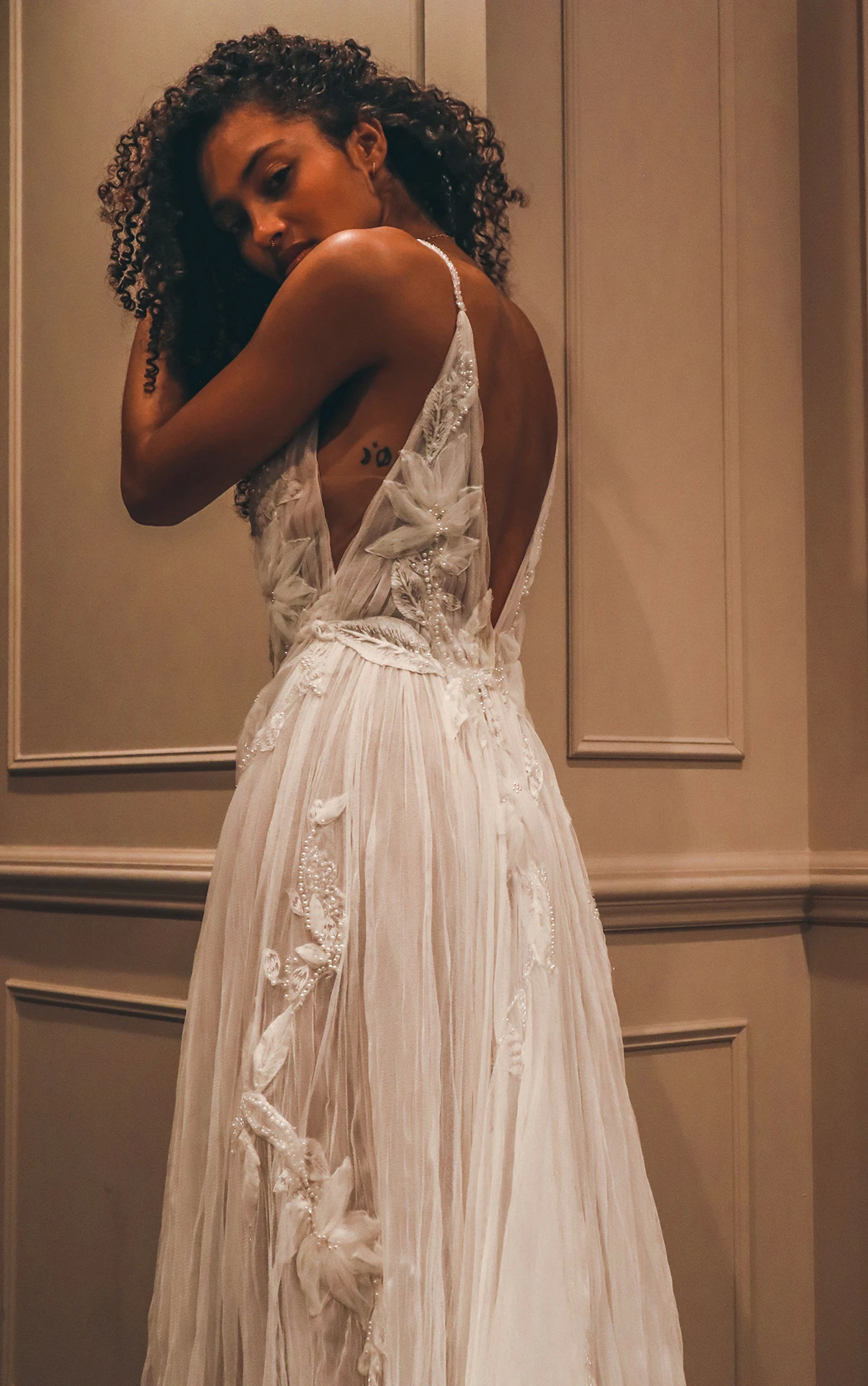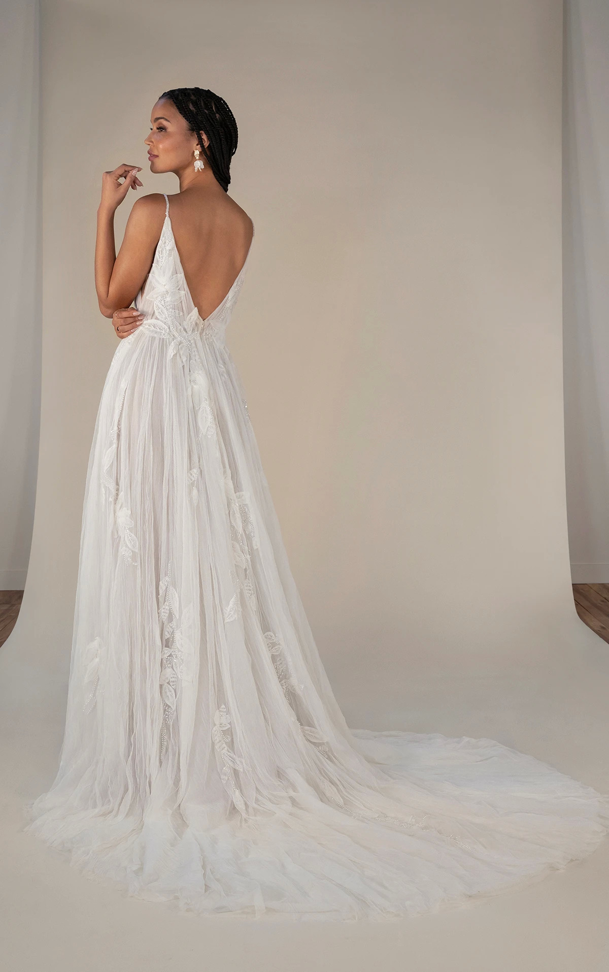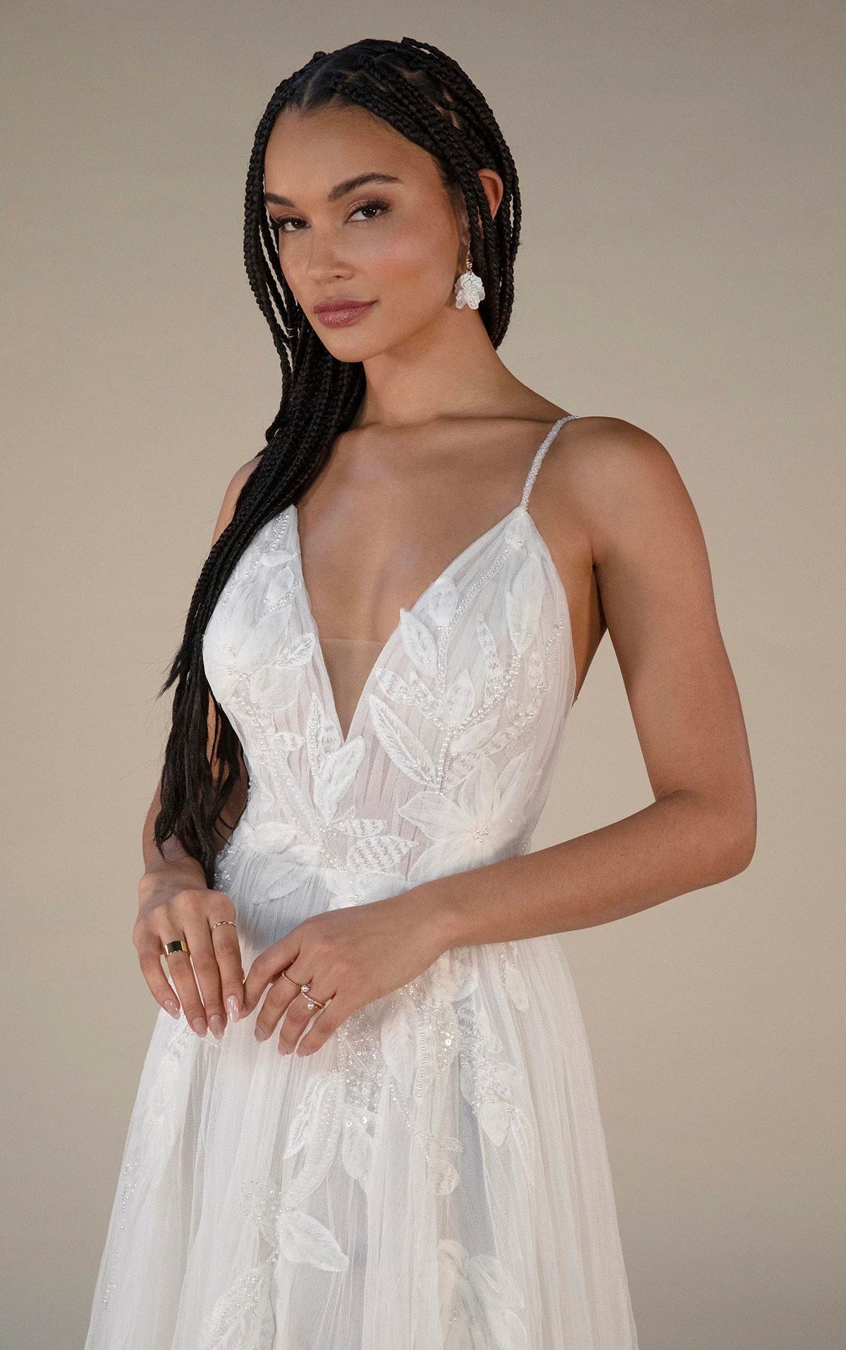 Designed for the free spirit, the Georgi gown is the epitome of ethereal glamour. The dreamy soft A-line silhouette features a deep V-neckline, spaghetti straps, a sheer bodice and subtle yet sexy side cutouts. The beautiful pearl beading embellishment, floral lace, embroidery and tulle adds gorgeous texture, while the open back and flowing train is destined to turn heads on and off the aisle at your boho wedding.