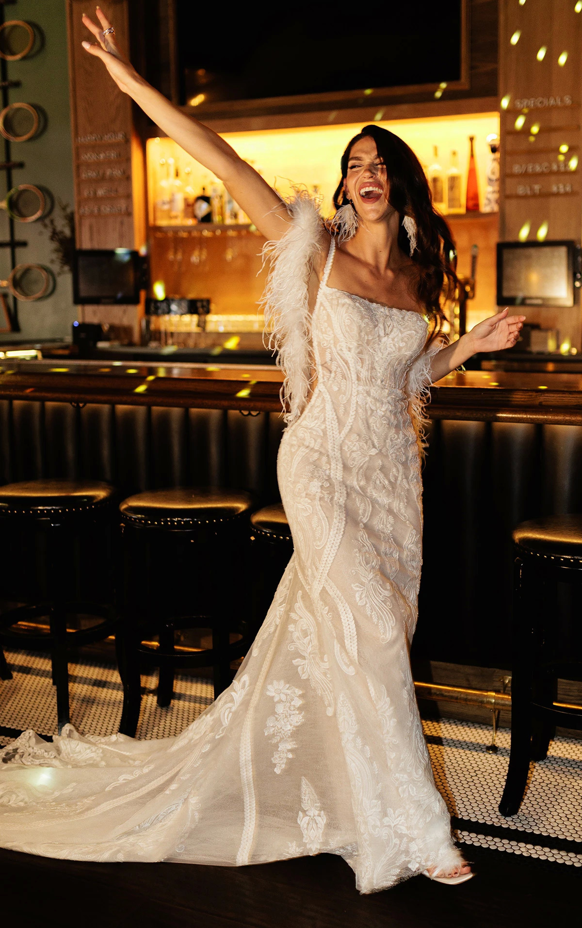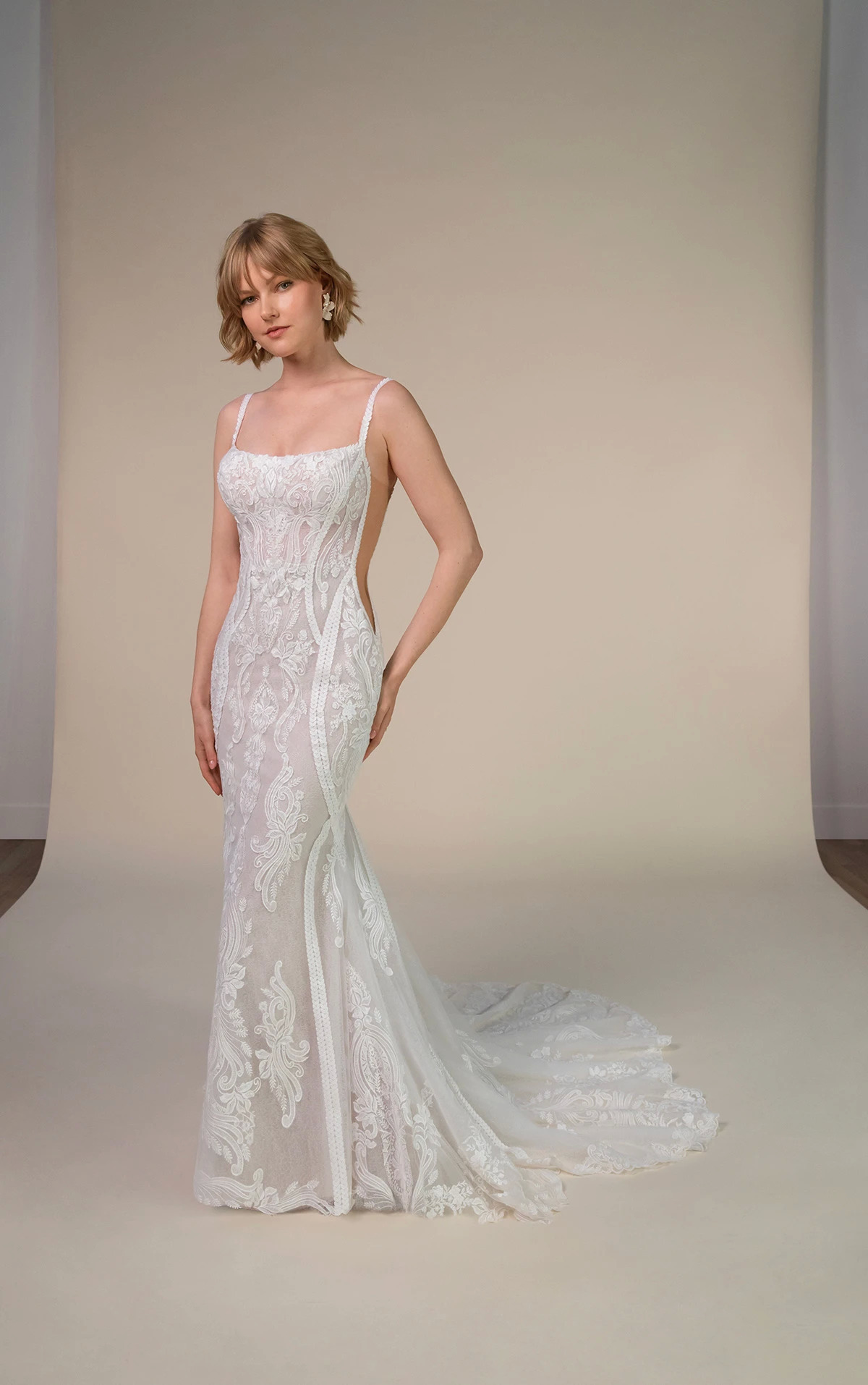 Minimal, modern and daring, the esra gown brings bold detail to effortless bohemian design. Crafted in fully matte graphic lace, this fit-and-flare silhouette hugs the figure with clean lines and a linear texture. A square neckline and slim straps offer minimalist structure, while deep side cutouts and an open back add a sexy edge. The soft flared trumpet skirt leads into a scallop-hemmed train for an added touch of romance. Comfortable and easy-to-wear construction, this lace wedding dress is made for the bride with a fearless spirit and laid-back style.