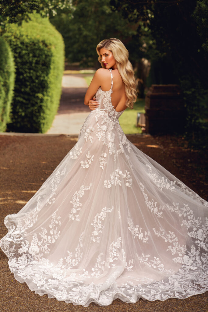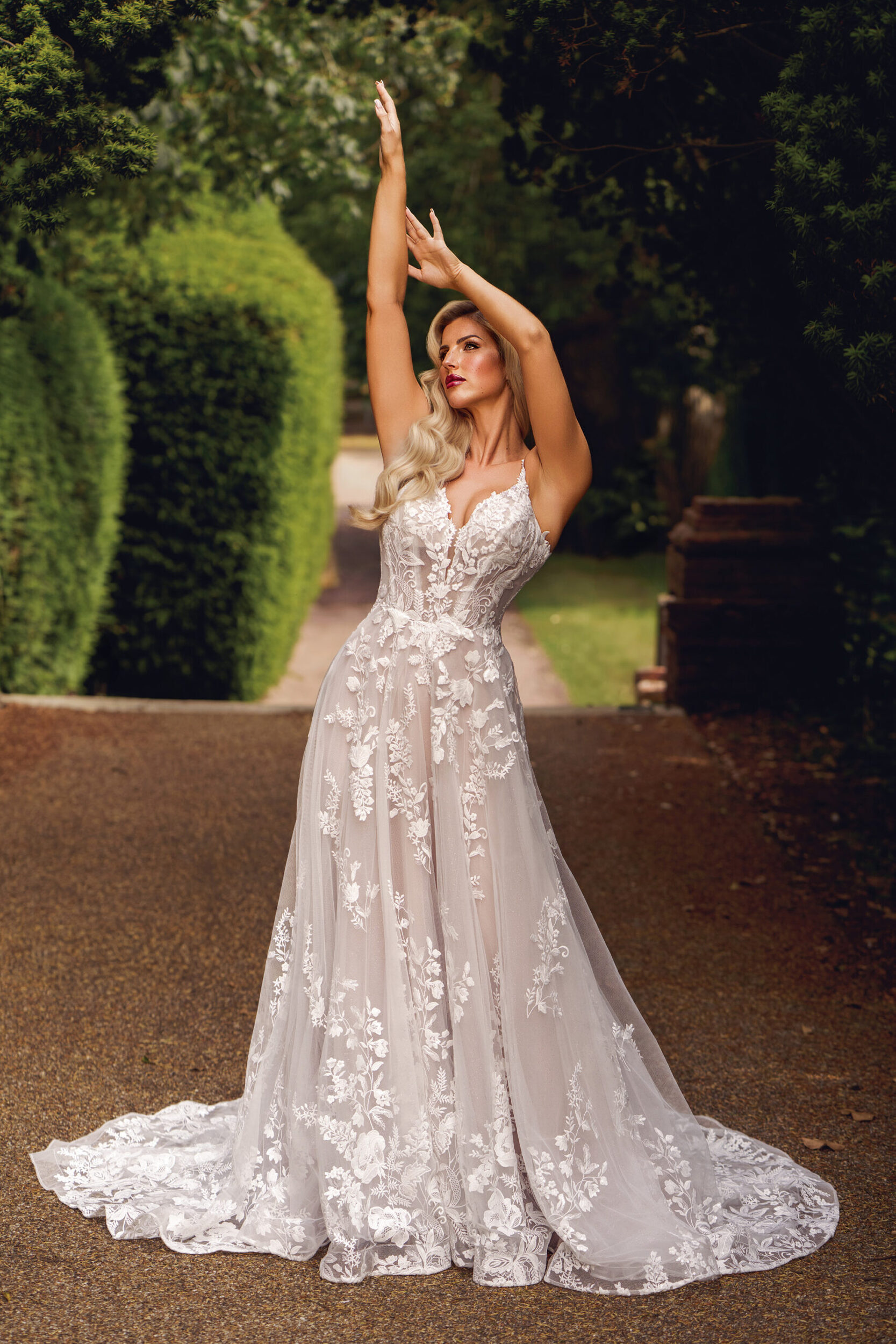 A euphony of wild flowers and feuille cascade from the delicate straps and sheer bodice, with plunge and nude modesty, onto the full ballgown skirt where a secret sparkle underlay adds a touch of glamour to the sweeping chapel train.