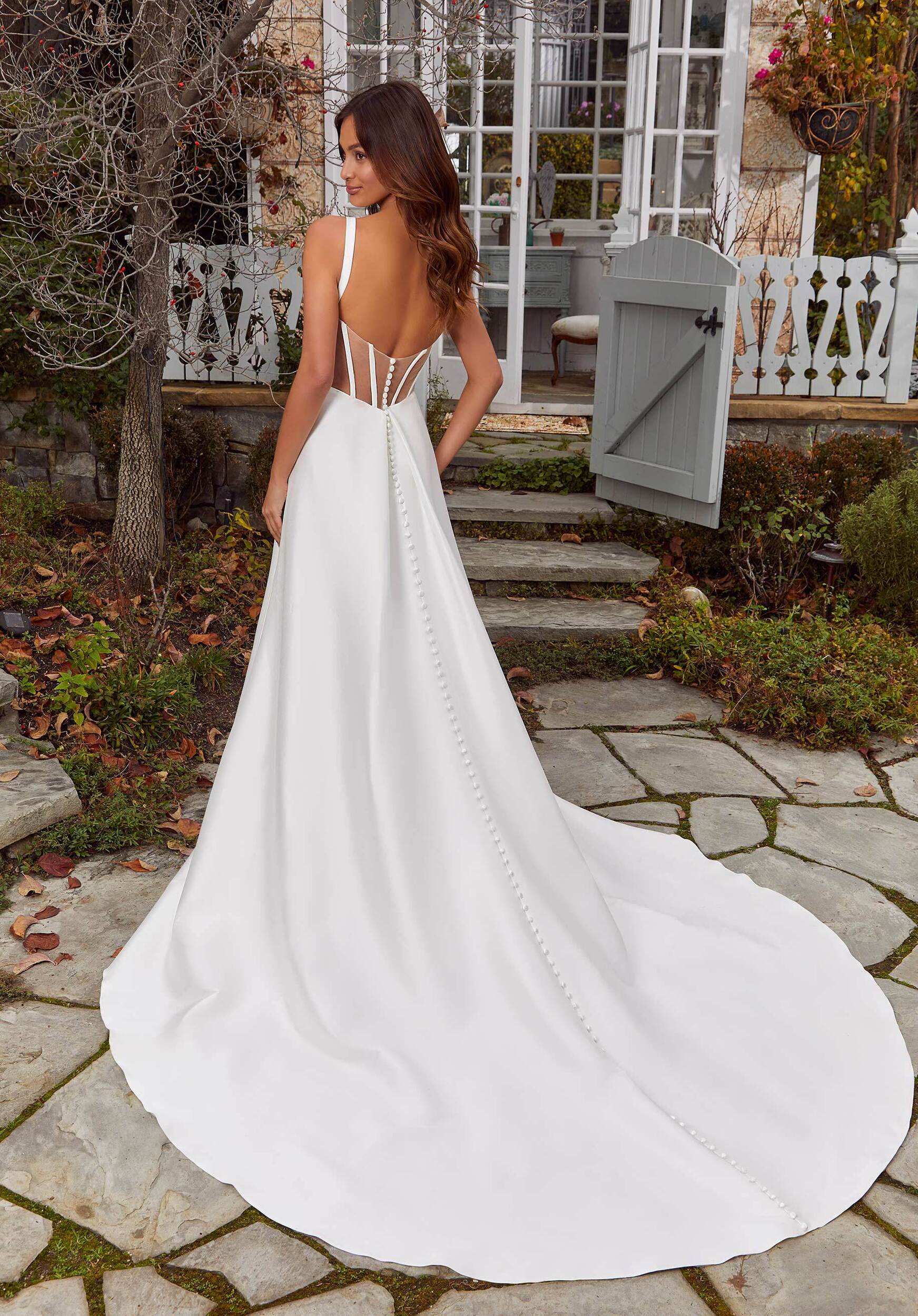 Simple and sophisticated, our Roxie designer wedding dress puts you on display with its clean look. The slim A-line gown has a v-neckline on a surplice bodice with draped detailing that creates a faux-wrap skirt, serving a sultry dose of leg. Our favourite part is the sheer back with couture boning and buttons leading down to the hemline for a timeless look.