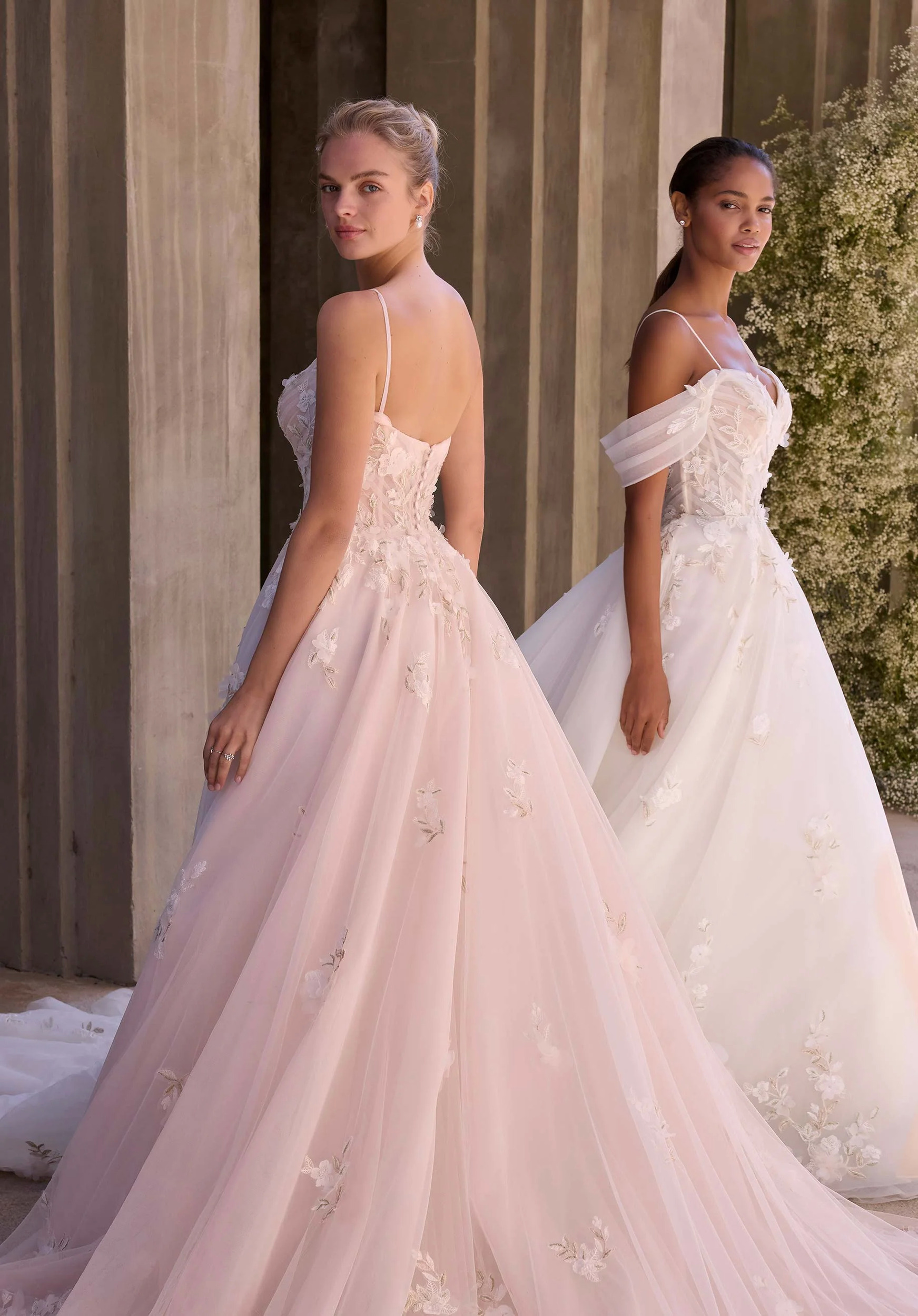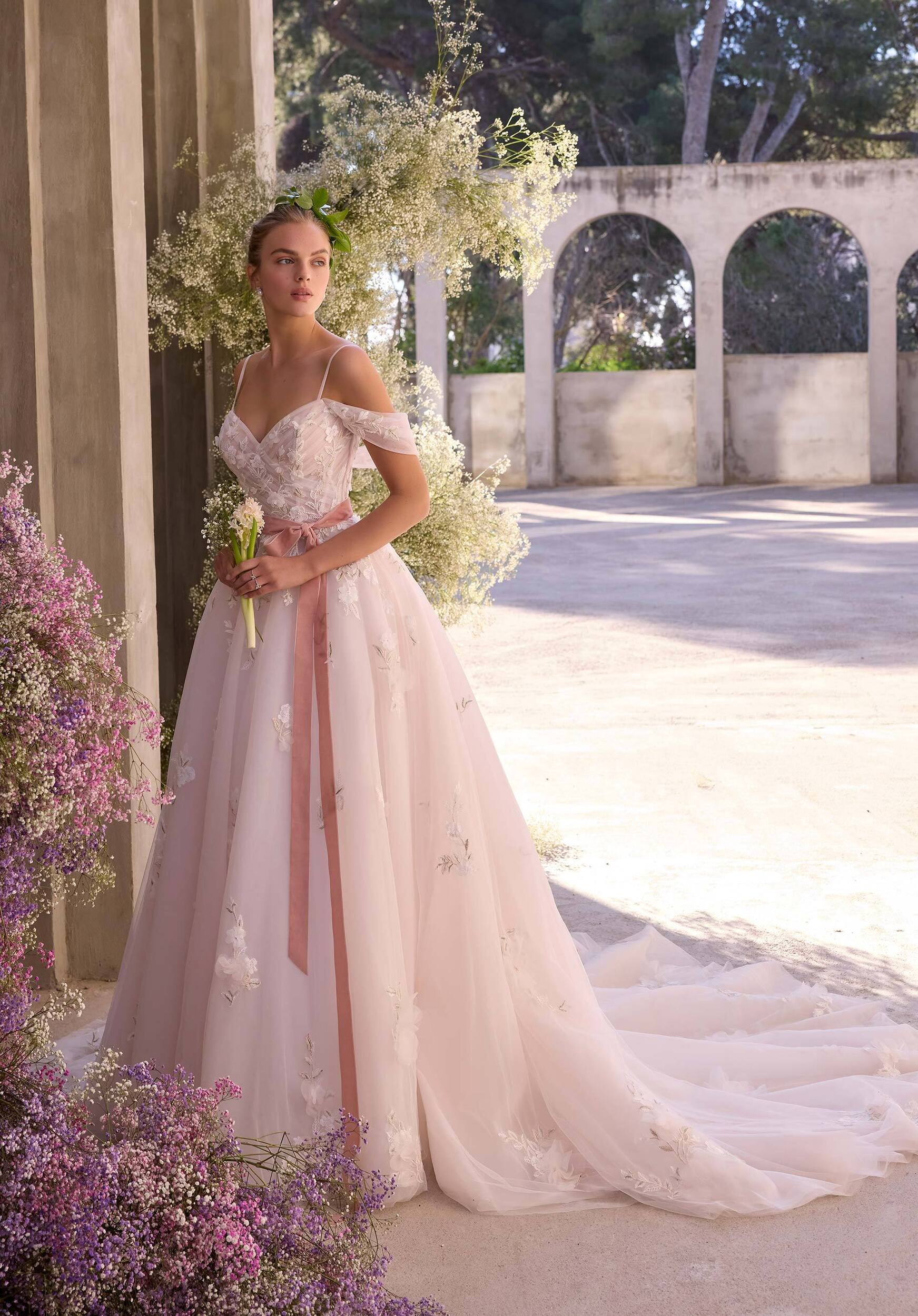 A-line wedding dress has a draped sweetheart bodice with detachable off-the-shoulder draped on floral embroidered tulle.