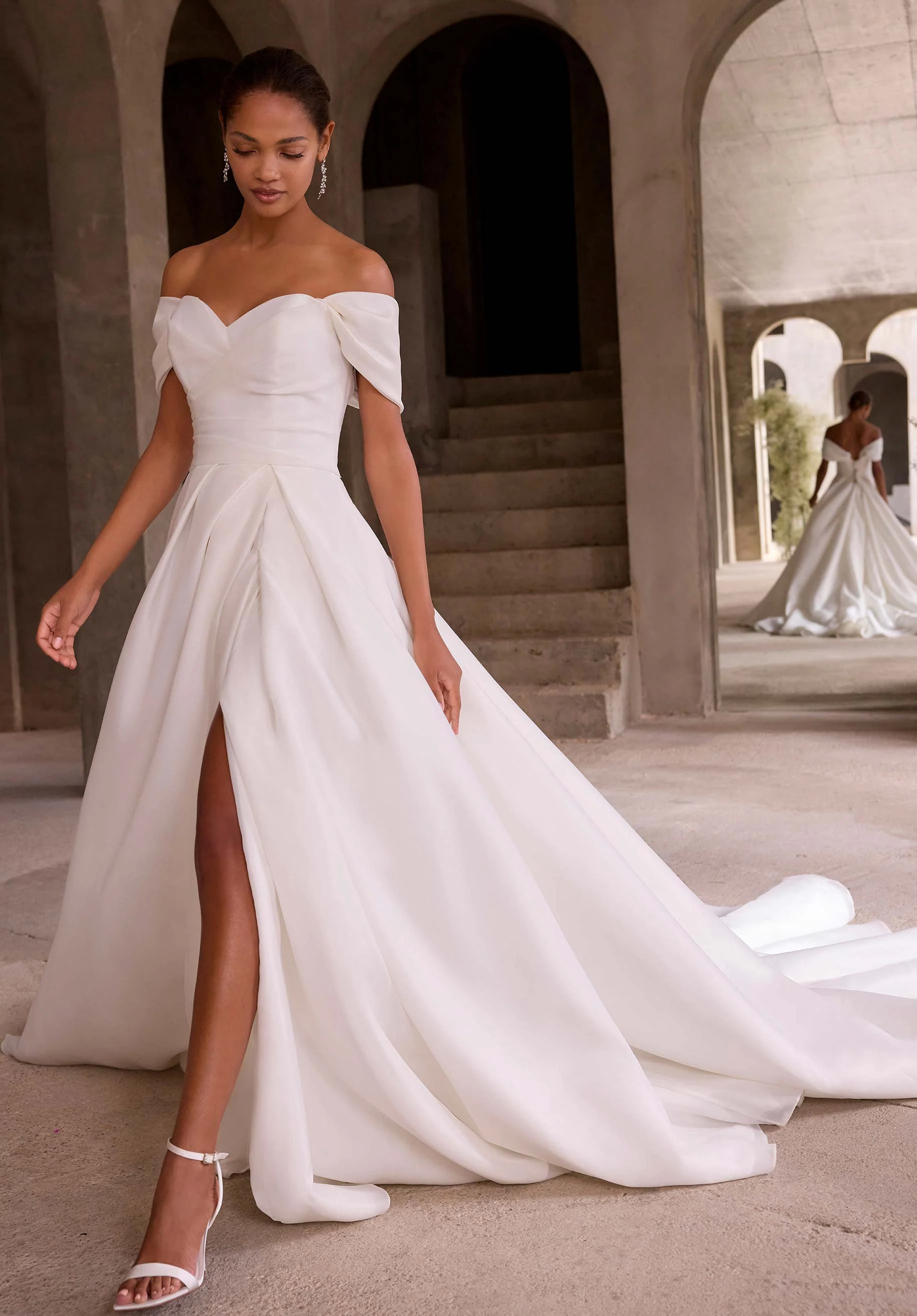 A-line wedding dress has a strapless sweetheart neckline with detachable off-the-shoulder sleeves on a wrap skirt in heavy organza