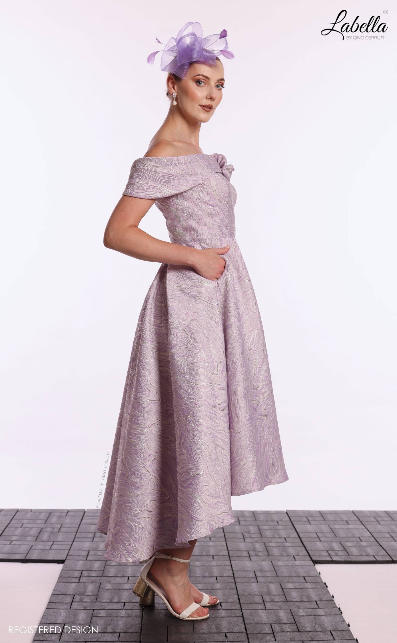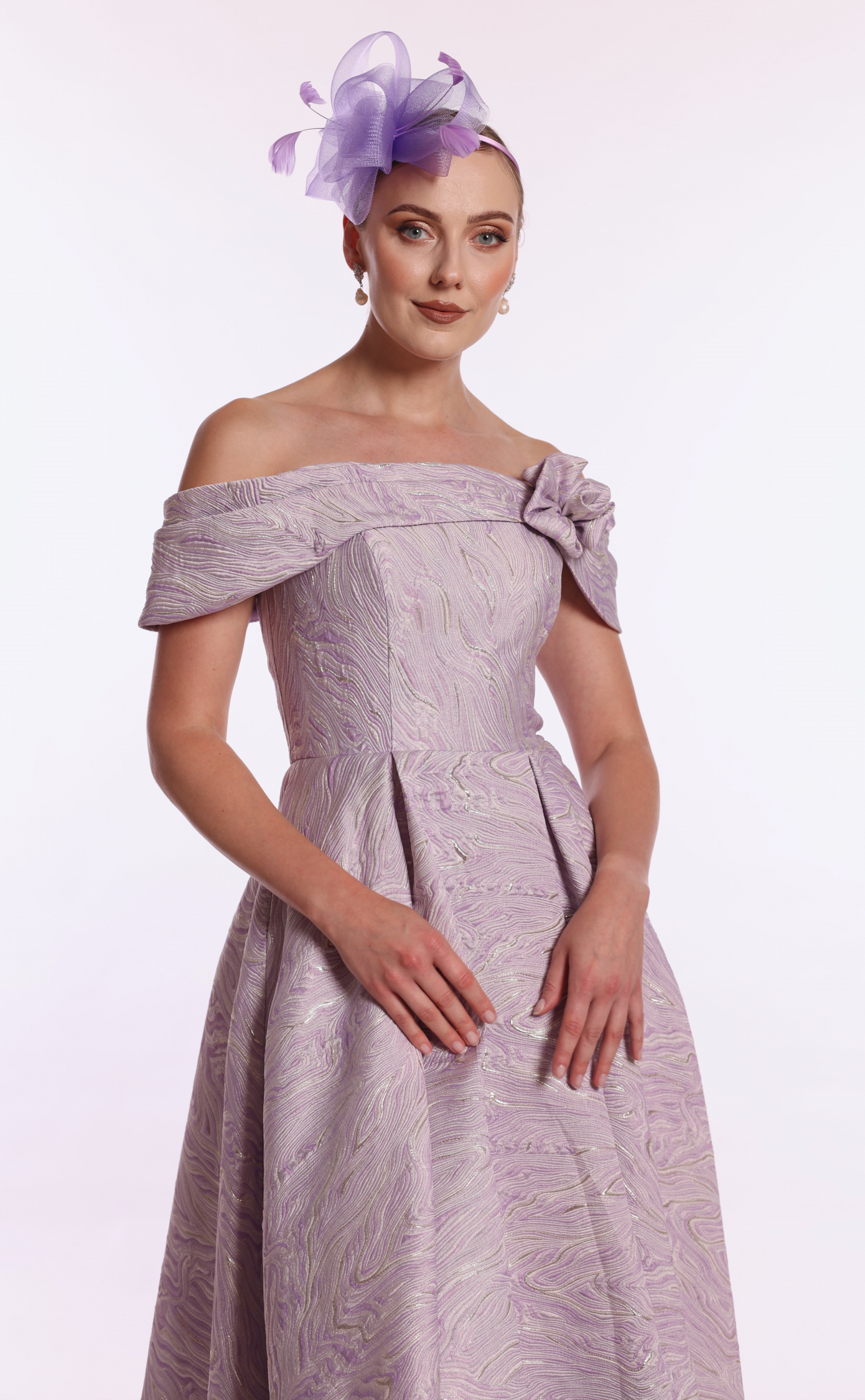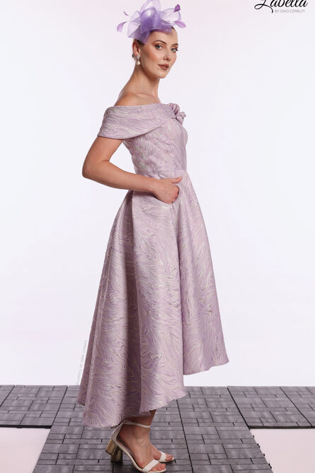 Step into elegance with our off-shoulder jacquard A-line dress, designed to make you stand out at any occasion. This beautiful tea-length dress features delicate pleating on the sleeves, adding a touch of sophistication. The pleated skirt flows gracefully, while the intricate flower details enhance the overall feminine charm of the gown.