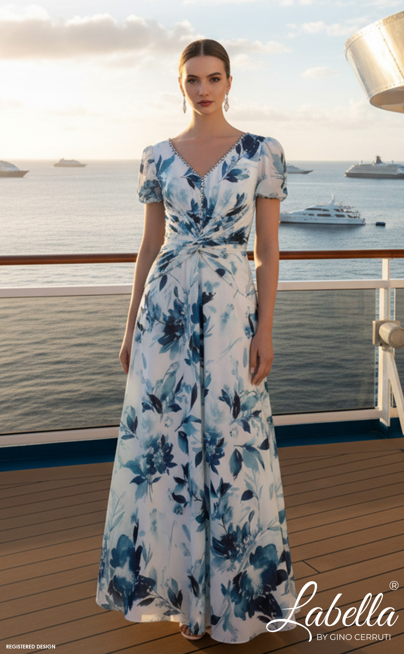 This stunning ankle-length printed dress features a twisted detail at the waist and is adorned with beading around the neck and cuffs. The subtle puff sleeves add a youthful, timeless touch, making it perfect for elegant ladies at summer weddings and events.