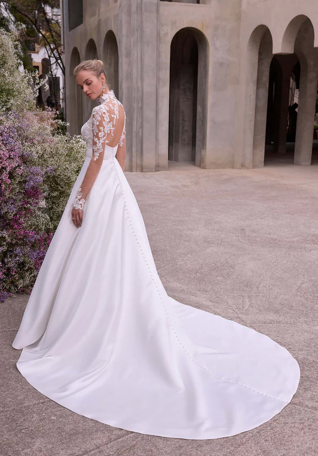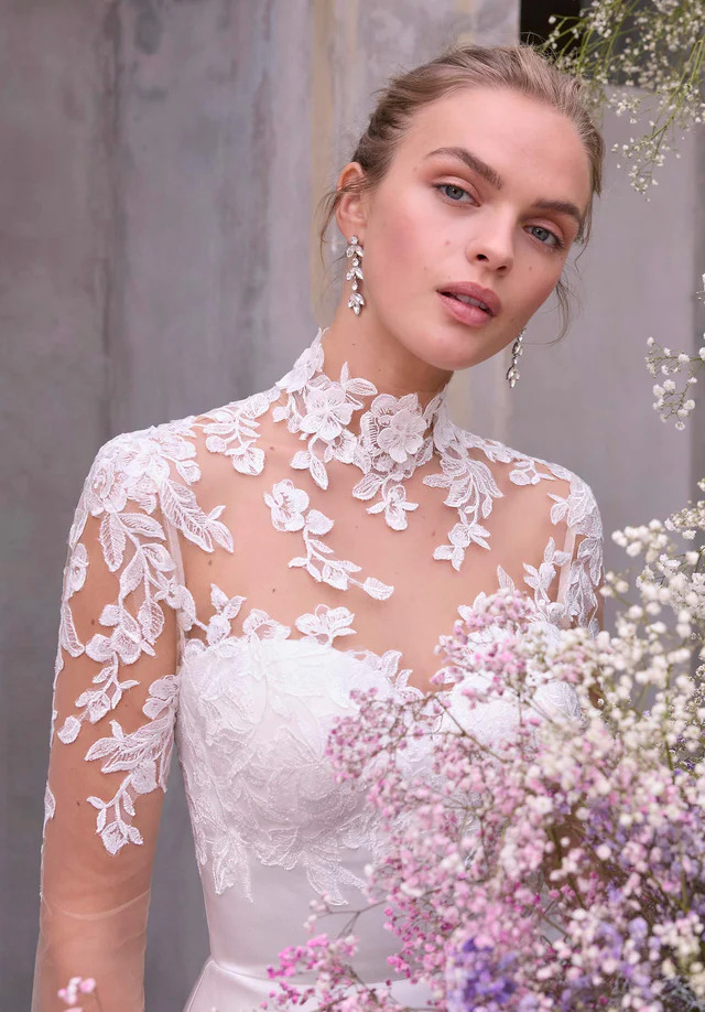Ball gown wedding dress has an illusion bodice with floral lace appliqué, sheer long sleeves, and a sweetheart neckline on a satin skirt.