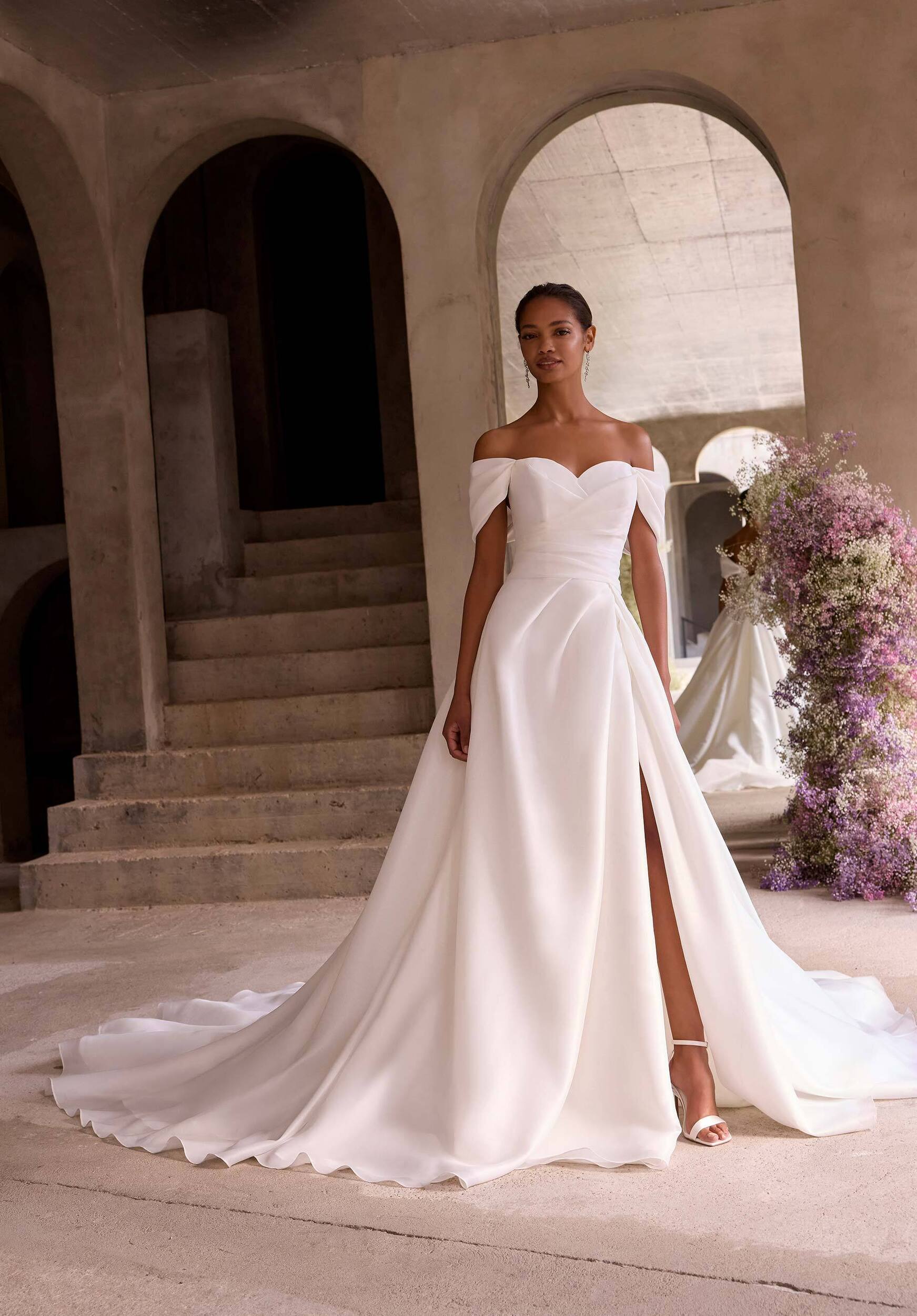 A-line wedding dress has a strapless sweetheart neckline with detachable off-the-shoulder sleeves on a wrap skirt in heavy organza